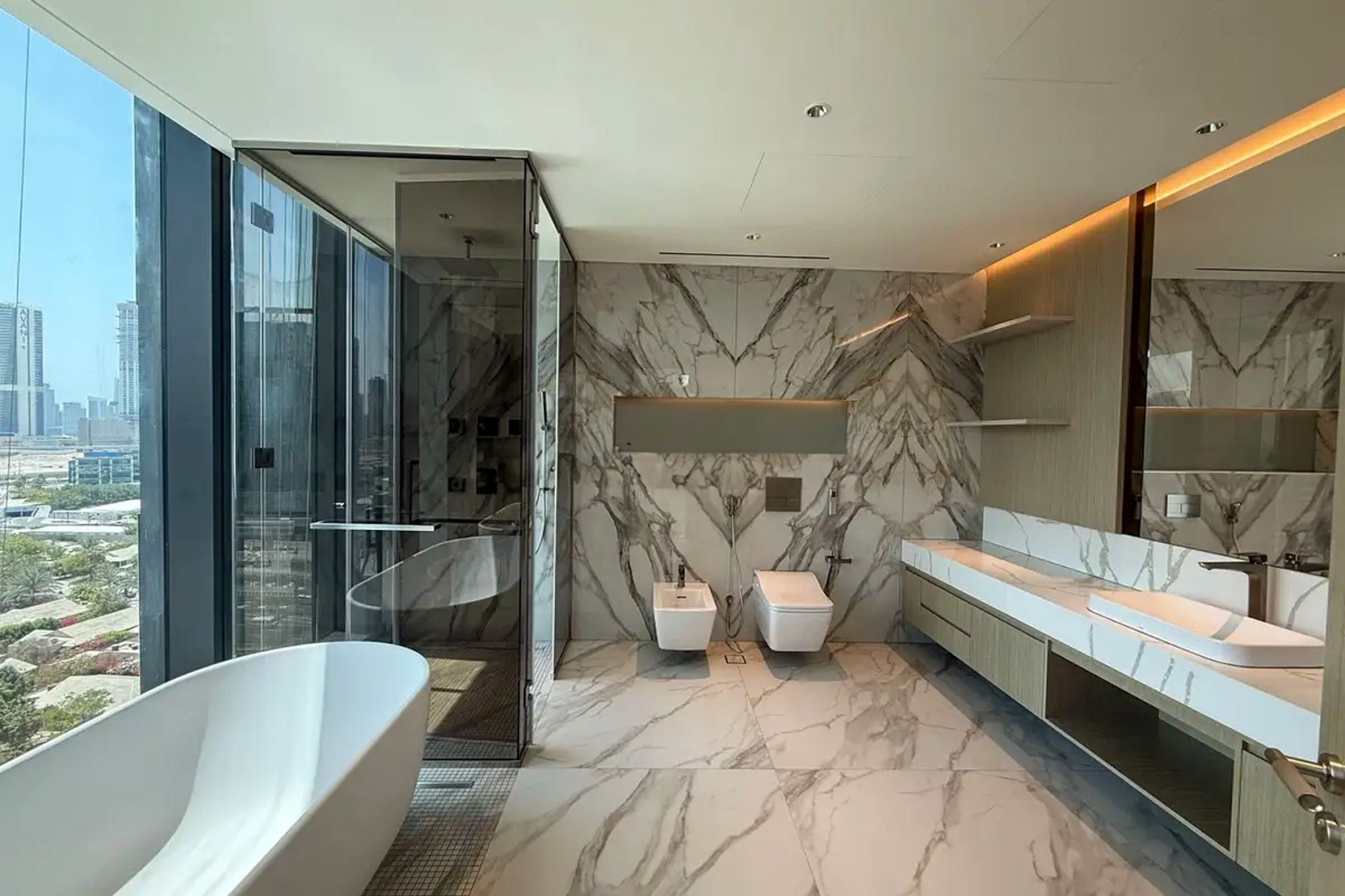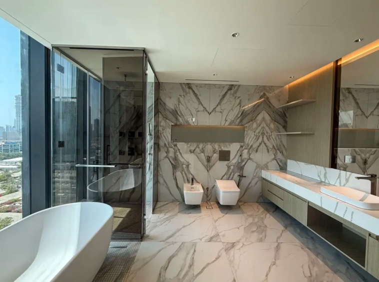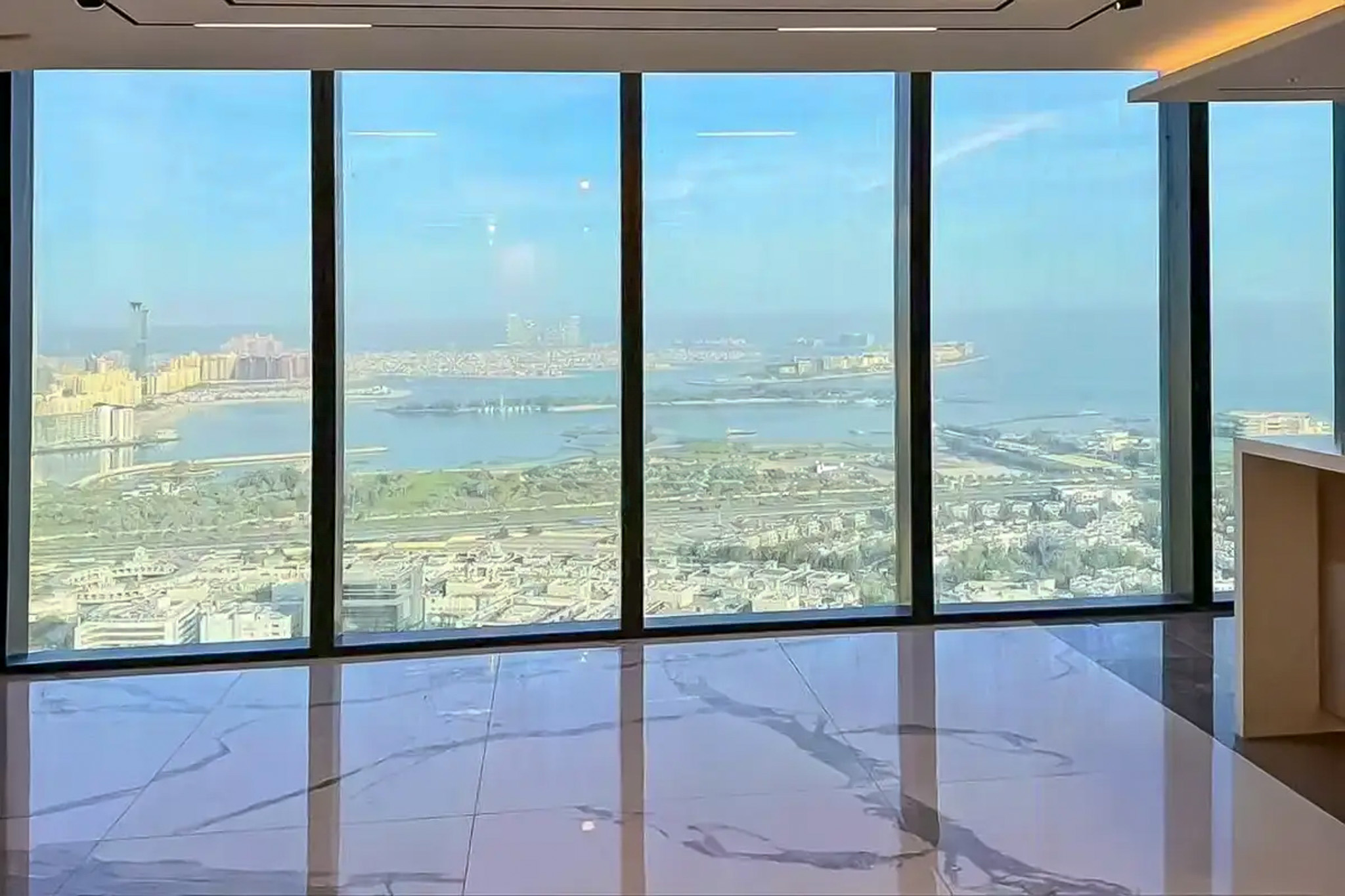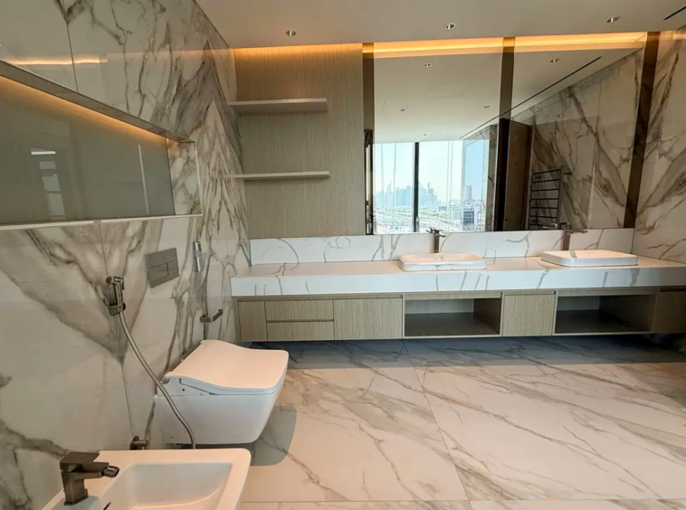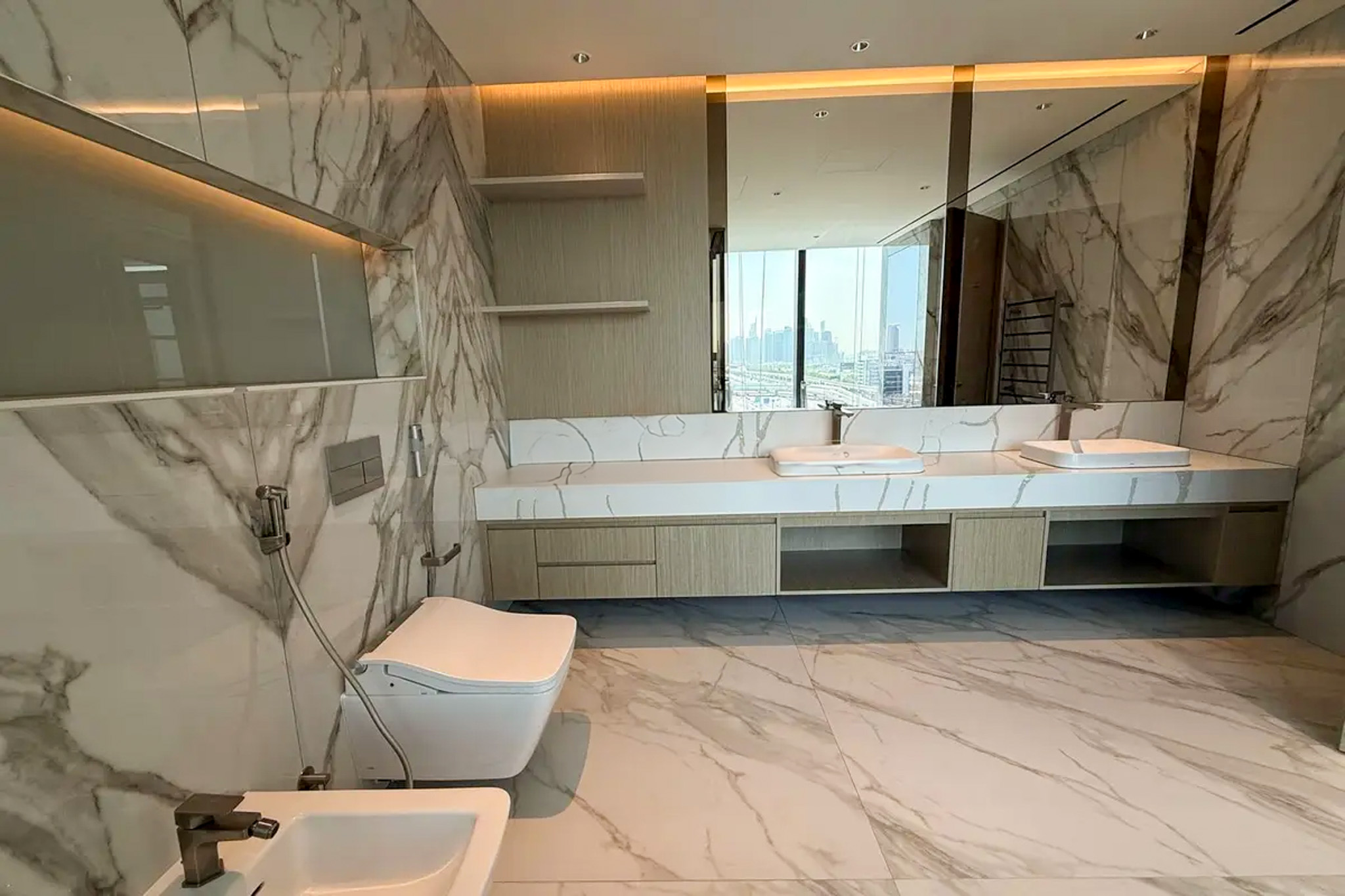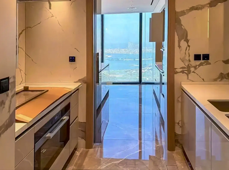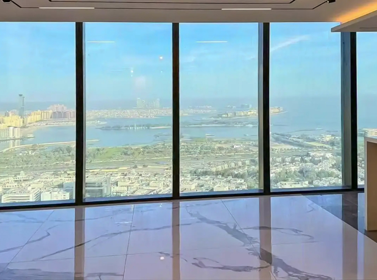 4 Bedroom all Ensuite , huge Master with Walk-in-Closets , all closets finished with premium leather with a Safe Room in the master . The secondary bedrooms all have full Views of the Burj-al-Arab and the palm